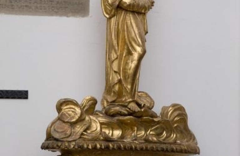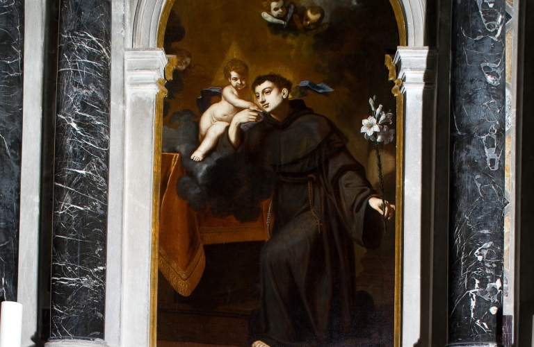 The right side of the church nave is rounded off by the altar of Lamentation (Pieta), where the original altar piece is missing as well. The next altar in the direction towards the church door is dedicated to St. Andrew, the patron saint of the fishermen’s confraternity. The last altar on the right is dedicated to the Franciscan saint St. Didacus. Until the Second World War a reliquiary with the bones of Blessed Monaldus da Capodistria was placed on this altar. The fourteen Stations of the Cross on the walls were painted by Lorenzo Pedrini in 1746. Directly over the church entrance is the organ loft with the organ of the Venetian master Francesco Merlini of 1805. It is a fully preserved Venetian organ with the original disposition. In the church one can also see the procession signs with the statues of patron saints of various confraternities and gold-plated lanterns used in festive processions.
