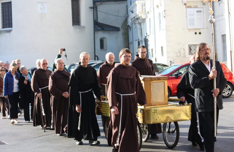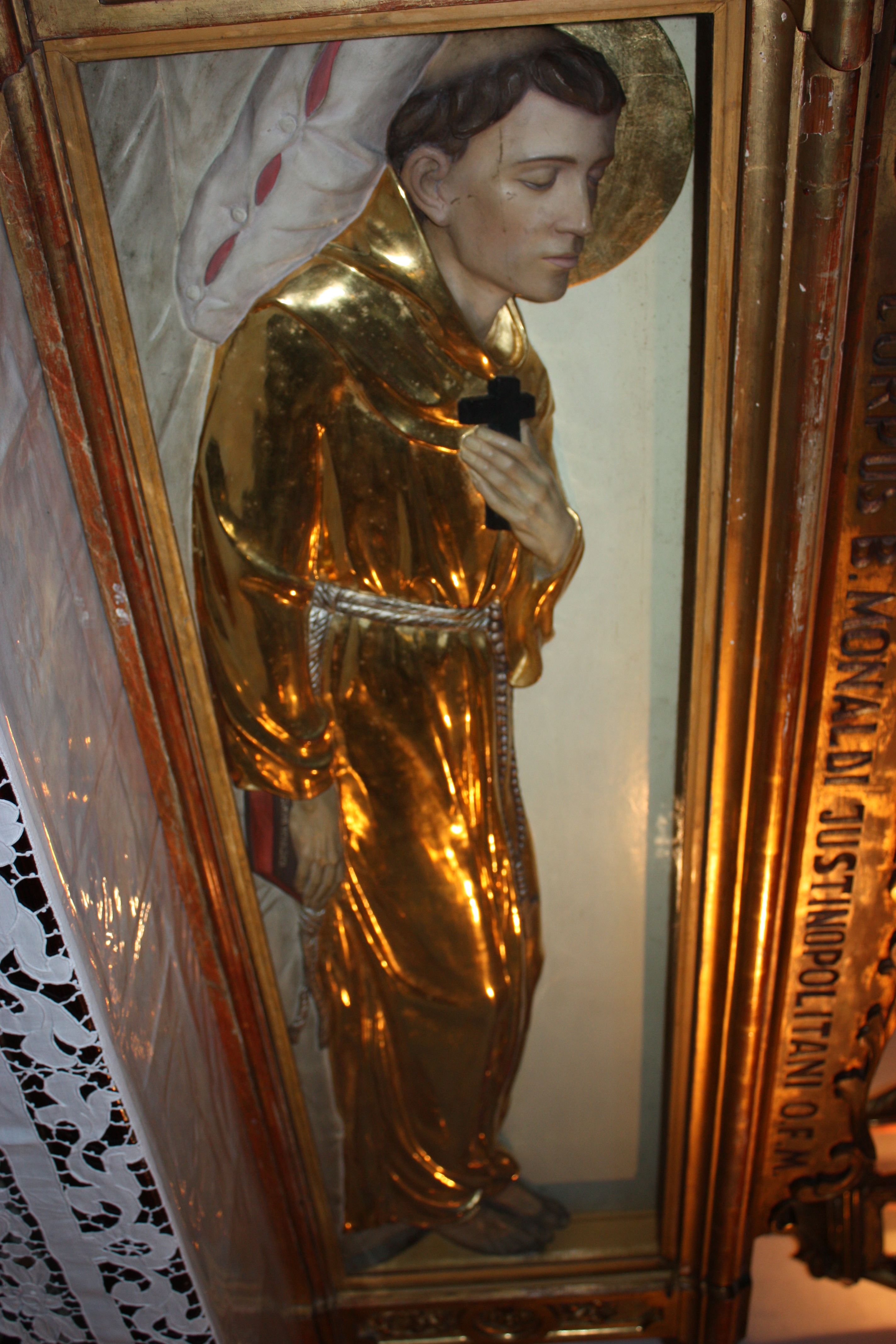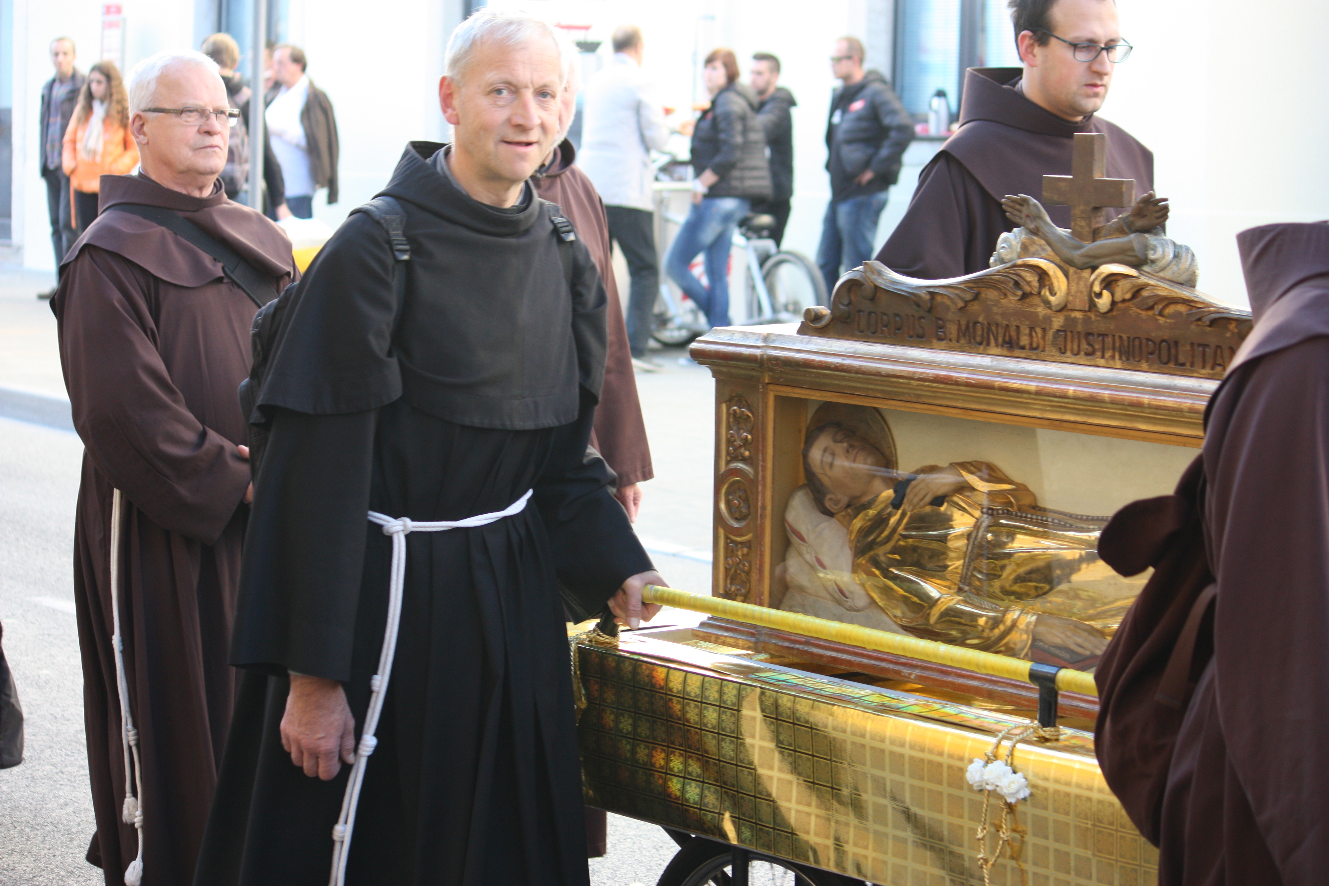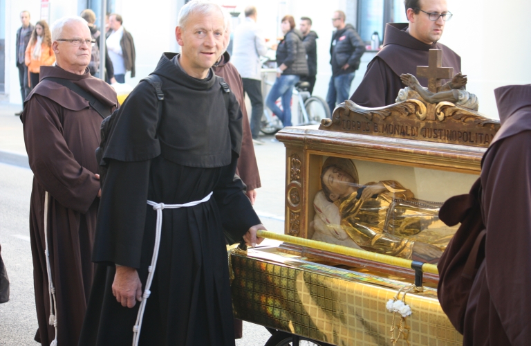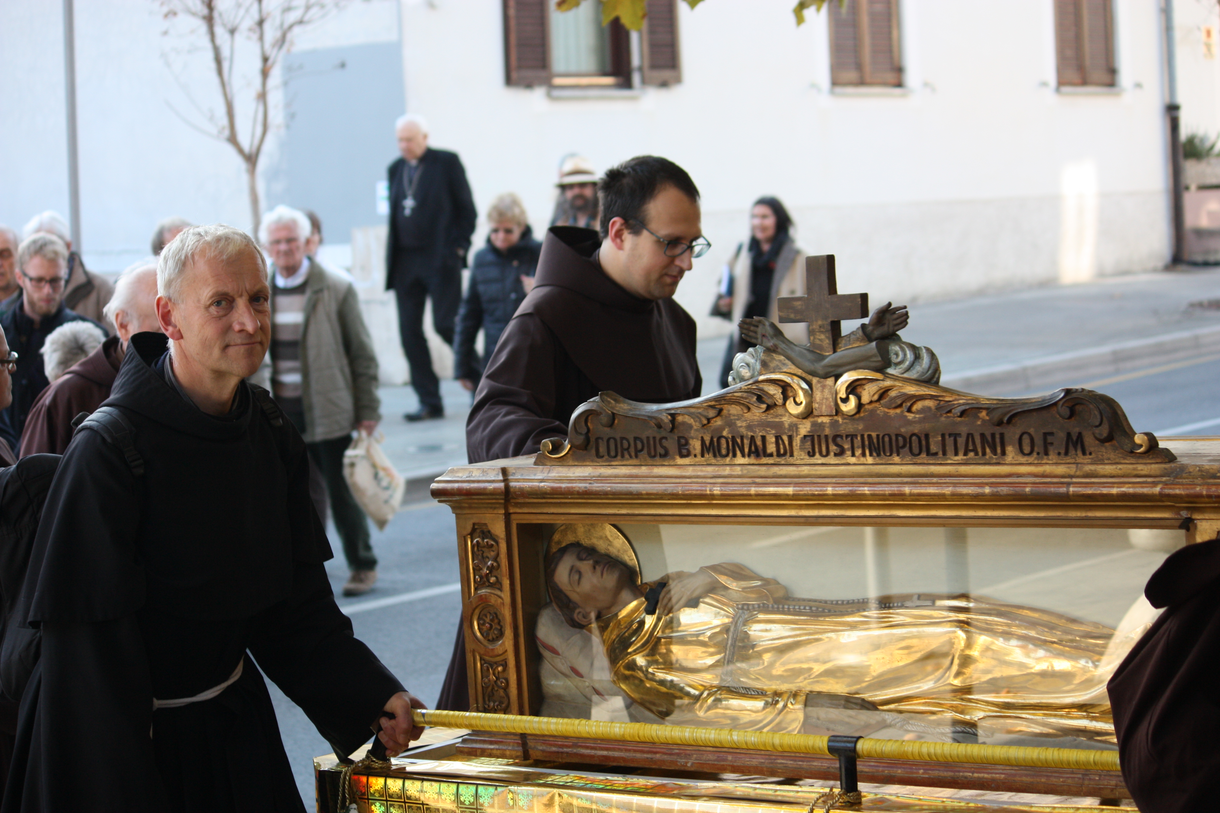 Vse od njegove smrti so ljudje gojili vero, da je Monaldo pridružen zboru svetnikov v nebesih. Njegove telesne ostanke so s častjo hranili v cerkvi sv. Frančiška do leta 1806, ko je Napoleon samostan ukinil. Relikvije so preko družine Gravisi končno prišle v koprsko stolnico, kjer so jih nekoč celo hoteli pokopati na pokopališču. Leta 1901 je škof dovolil, da se skrinjica z relikvijami izroči cerkvi sv. Ane. 24. junija 1904 je škof dr. Frančišek Nagl pregledal svete kosti in potrdil njihovo javno češčenje, ki je potekalo vse do leta 1806. V nedeljo 1. avgusta 1904 so bile relikvije postavljene v cerkev sv. Ane v javno češčenje. Skrinja z relikvijami je bila pred letom 1954 skrivaj prenesena v Benetke, nato pa v cerkev Velike Gospe v Trstu, kjer se hranijo še zdaj. Samo upamo lahko, da se bodo sveti ostanki blaženega Monalda čimprej vrnili v cerkev sv. Ane.